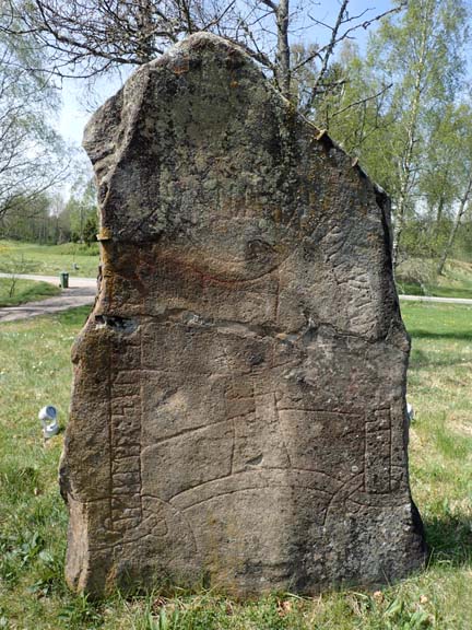 The sun is out. I take the road above camp into town. GPS shows no road. The ride is back on the old railroad bike path. Locals are put in shorts and bikinis, the glow of white flesh. Snake is even sun bathing. Oh yes the snakes are poisonous. Spot another rune stone. Stop to tune the bike in a small village park. An unmarked building looks like a toilet. I check it out as I have laundry. It is a shower and the other room has a toilet and sink. Shortly I am clean and the cloths are clean. I dry and the cloths dry as I ride down the bike path. I must turn and leave the level bike path. There are hills and I must ride with some traffic. I arrive in Boras in time to visit the tourist office. They have maps much of Sweden but not for the 30 miles to Gothenburg. Bike part is finally in the mail from London to Gothenburg. GPS and luck will get me there. Must get going as it is getting late and there is lots of build up around this city. Ten miles and I find a place to camp.