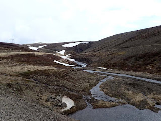 In the morning there is snow and rain so I start late. Wind from east south east so I have a head wind. I ride down to fjord and up the other side. Then down again and out the fjord. As I enter the next fjord I finally have a tail wind. An hour later I am at the head of fjord heading up the switchback. 372 meter summit was bit of a climb. Wind at the top pushed me back hard. At the next fjord I find a sheltered camp.